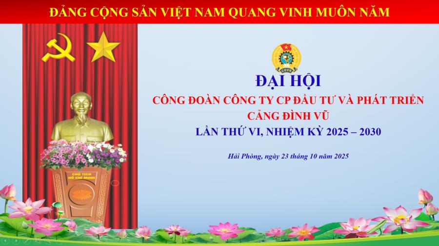 23 Thg10 Đại hội công đoàn Công ty cổ phần Đầu tư và Phát triển Cảng Đình Vũ lần thứ VI, nhiệm kỳ 2025-2030 Sáng ngày 23/10/2025, Công đoàn Công ty cổ phần Đầu tư và Phát triển Cảng Đình Vũ tổ chức Đại hội Công đoàn lần thứ VI, nhiệm kỳ 2025-2030 tại Hội trường Cảng Đình Vũ. Đại hội với sự tham gia của 71 đoàn viên Công đoàn được triệu tập đã bầu ra Ban Chấp hành Công đoàn Cảng Đình Vũ khóa mới cũng như bầu đoàn đại biểu dự Đại hội công đoàn Công ty CP Cảng Hải Phòng lần thứ XXVI.